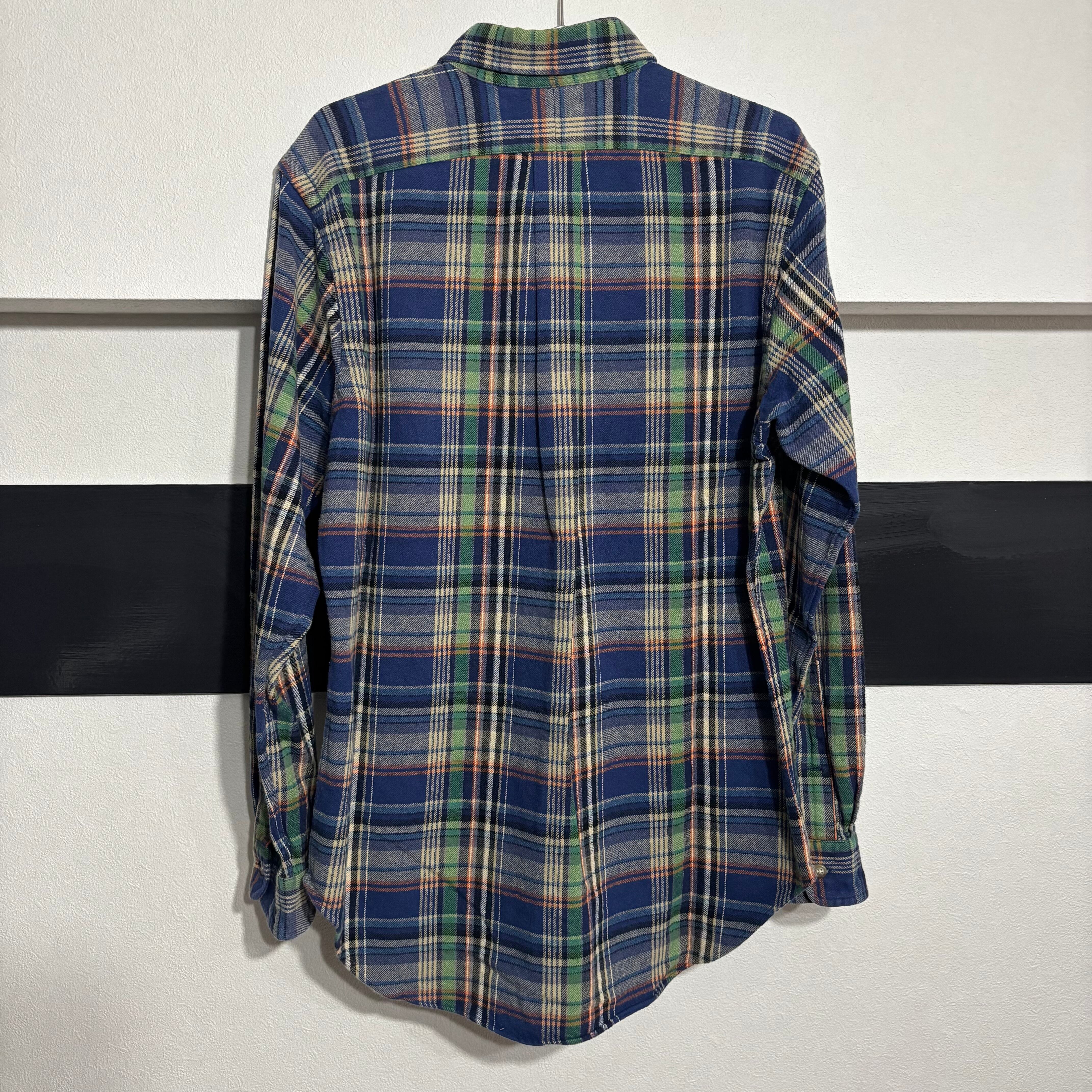 【製品概要】Ralph Lauren(ラルフローレン)の厚手のフランネルシャツ。ブルーをベースにグリーンやオレンジが映えるチェック柄で、胸元にはポロプレイヤー刺繍入り。柔らかめのコットンネル素材を使用しており、着心地抜群。カジュアルからアメカジ、古着ミックスまで幅広く使用可能。
