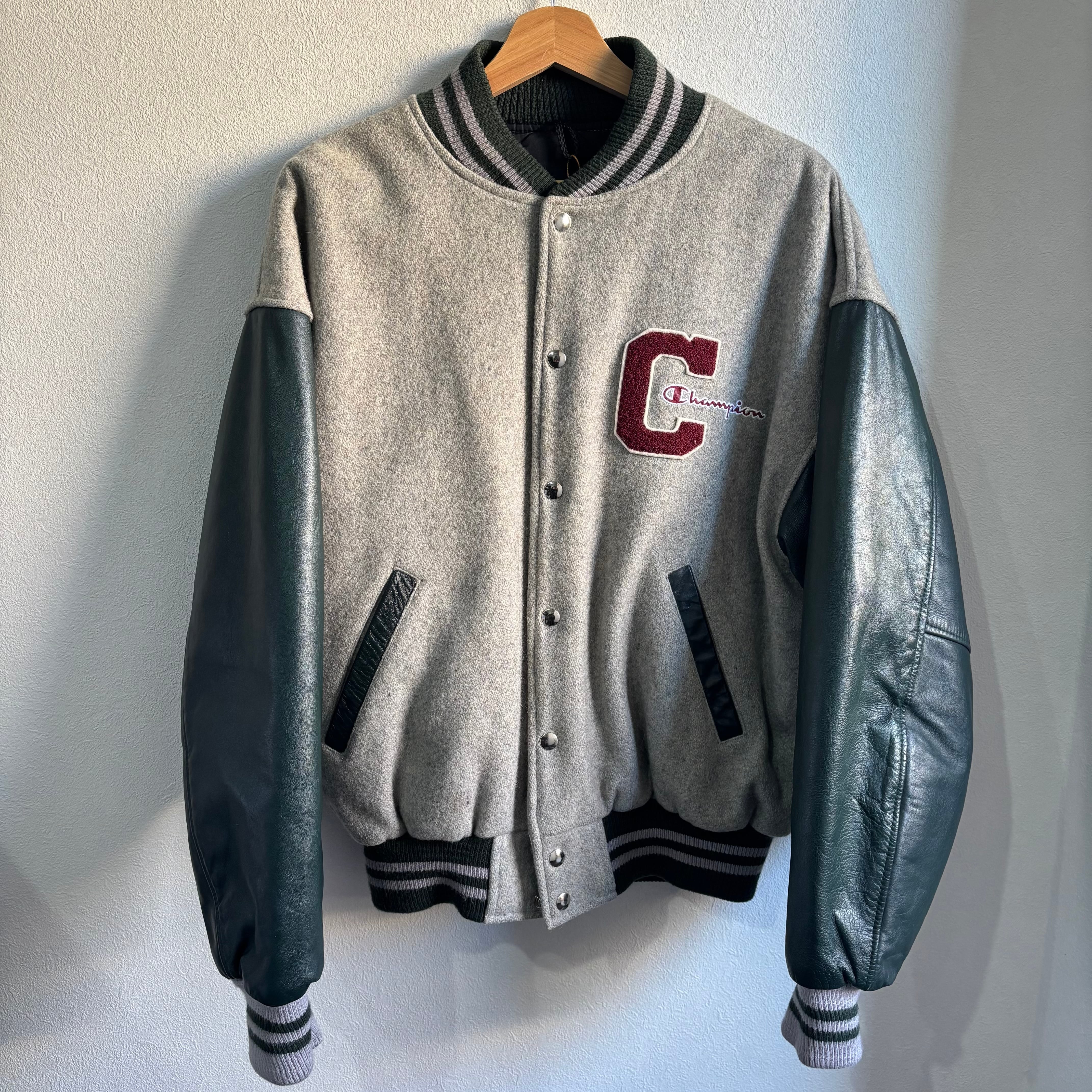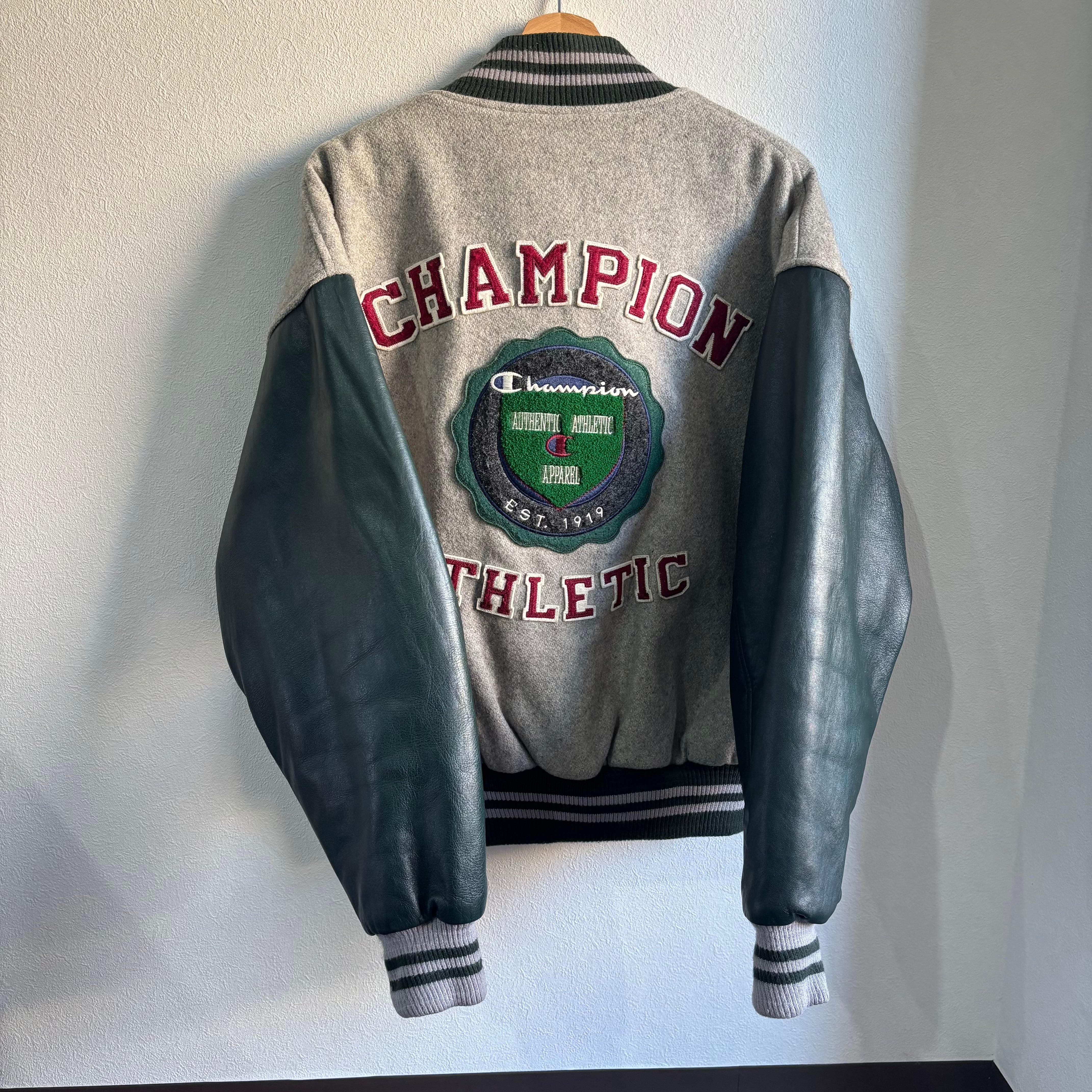 【製品概要】1990年代 Champion のスタジアムジャケット。ウールボディにレザー切替スリーブを採用した、王道のバーシティデザインです。